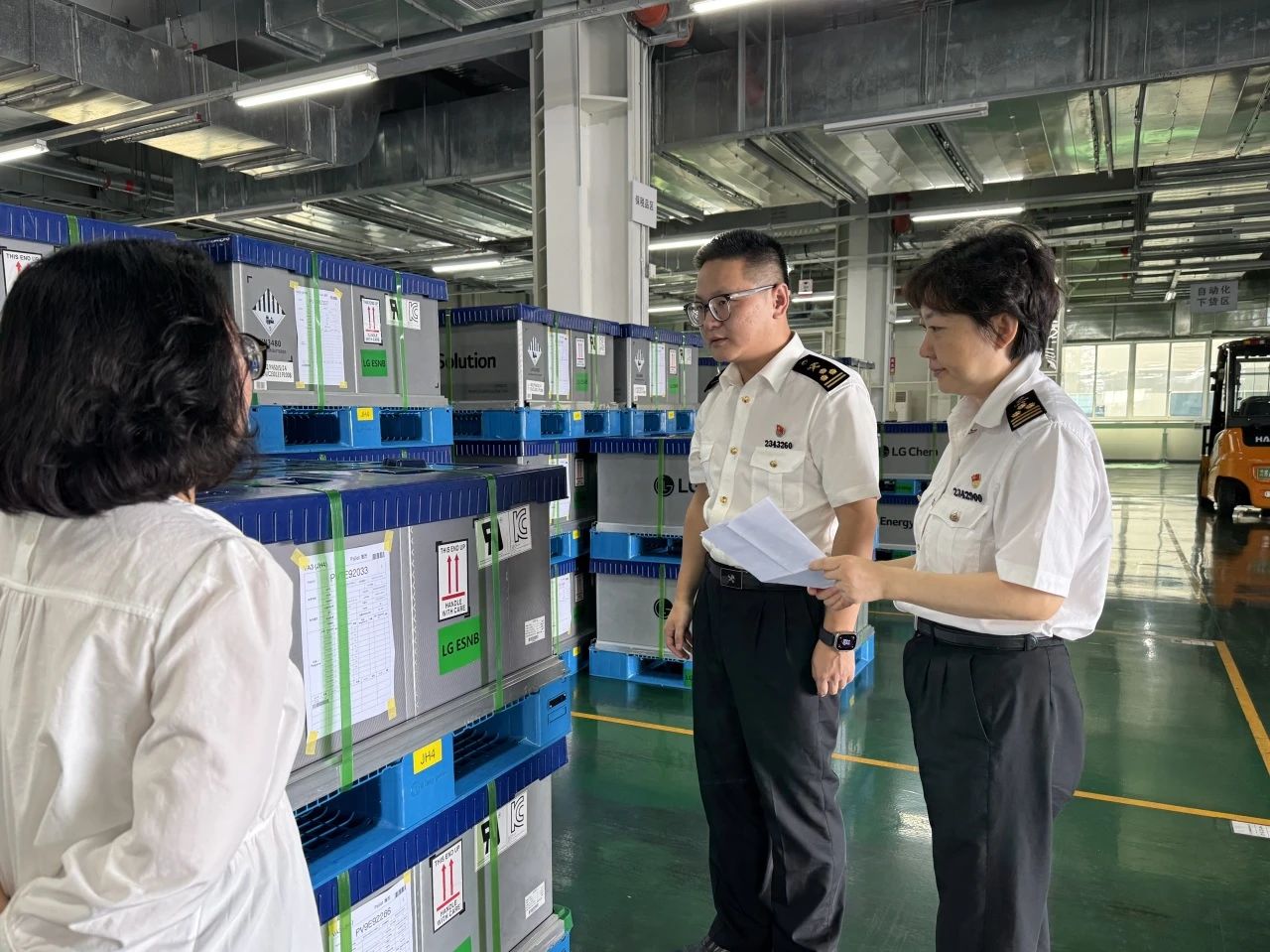 圖為:金陵海關(guān)關(guān)員對(duì)出口鋰電池循環(huán)包裝開(kāi)展現(xiàn)場(chǎng)查驗(yàn)。李巖/攝