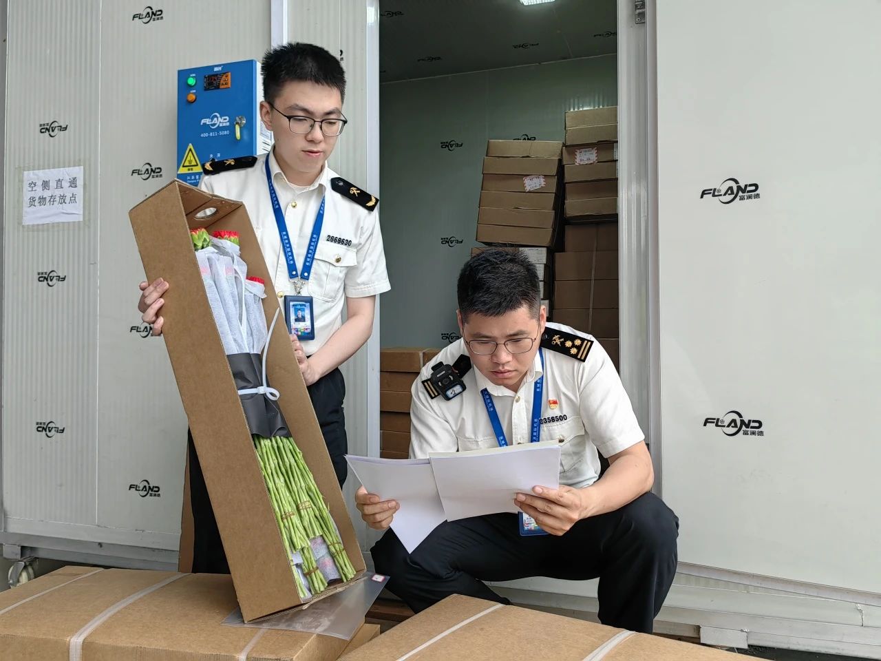 圖為:鹽城海關(guān)關(guān)員對(duì)“空側(cè)直通”貨物進(jìn)行監(jiān)管。王義/攝