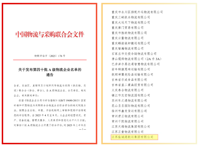 近日,中國物流與采購聯合會正式發布了全國第40批A級物流企業名單,鹽城港航運集團憑借其在物流行業的卓越表現獲得“3A級物流企業”認證。這一殊榮不僅是行業對公司綜合實力、服務品質的高度認可,更彰顯了航運集團在物流資源整合、高效運營以及創新驅動方面的標桿引領作用,為公司未來發展奠定了更加堅實的基礎。